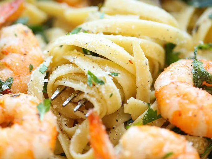 Toss heat, cooked pasta with remaining 1/4 cup cream. Add parsley and top with Parmesan cheese.